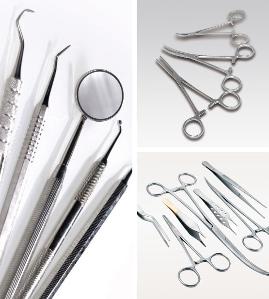 General Surgery – Scalpels, forceps, retractors, and clamps.